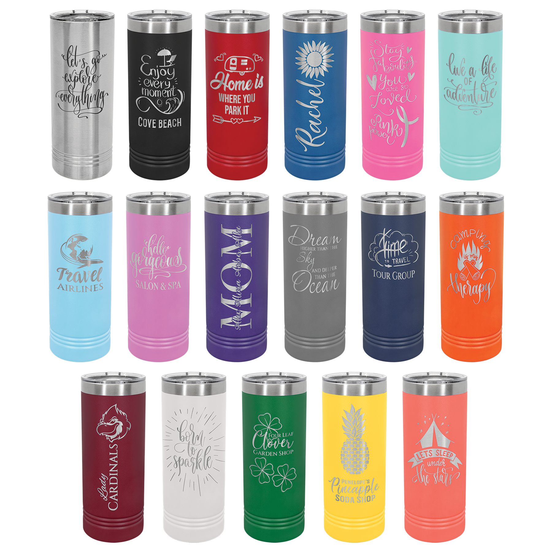 The same high endurance drink ware that Polar Camel has become known for is now available in a 22 oz. Skinny Tumbler! This tumbler is perfect for an easy grasp with smaller hands and is available in Stainless Steel and in 16 vibrant colors of Powder Coated finish that lasers beautifully! The included slider lid helps to prevent spills.